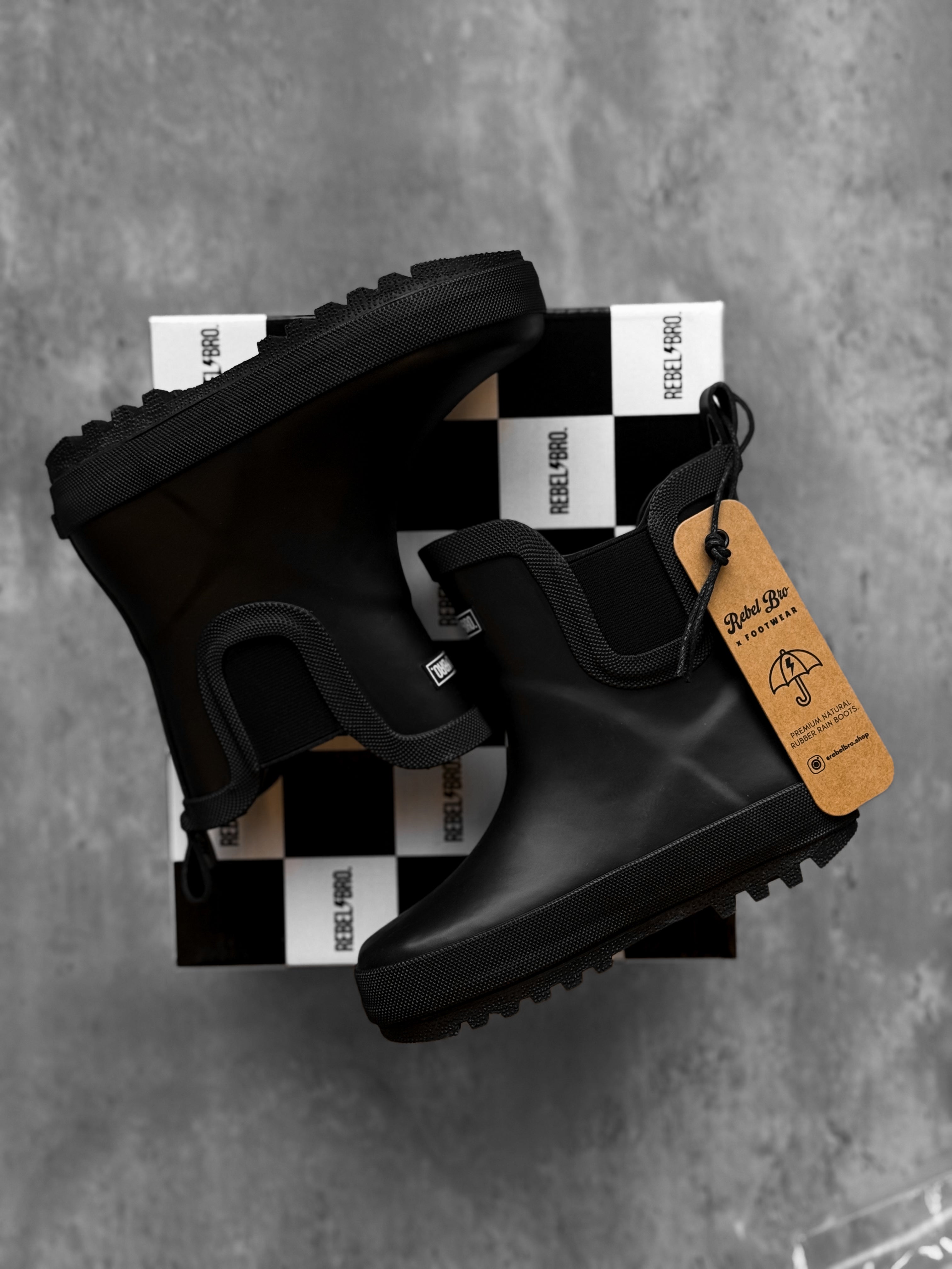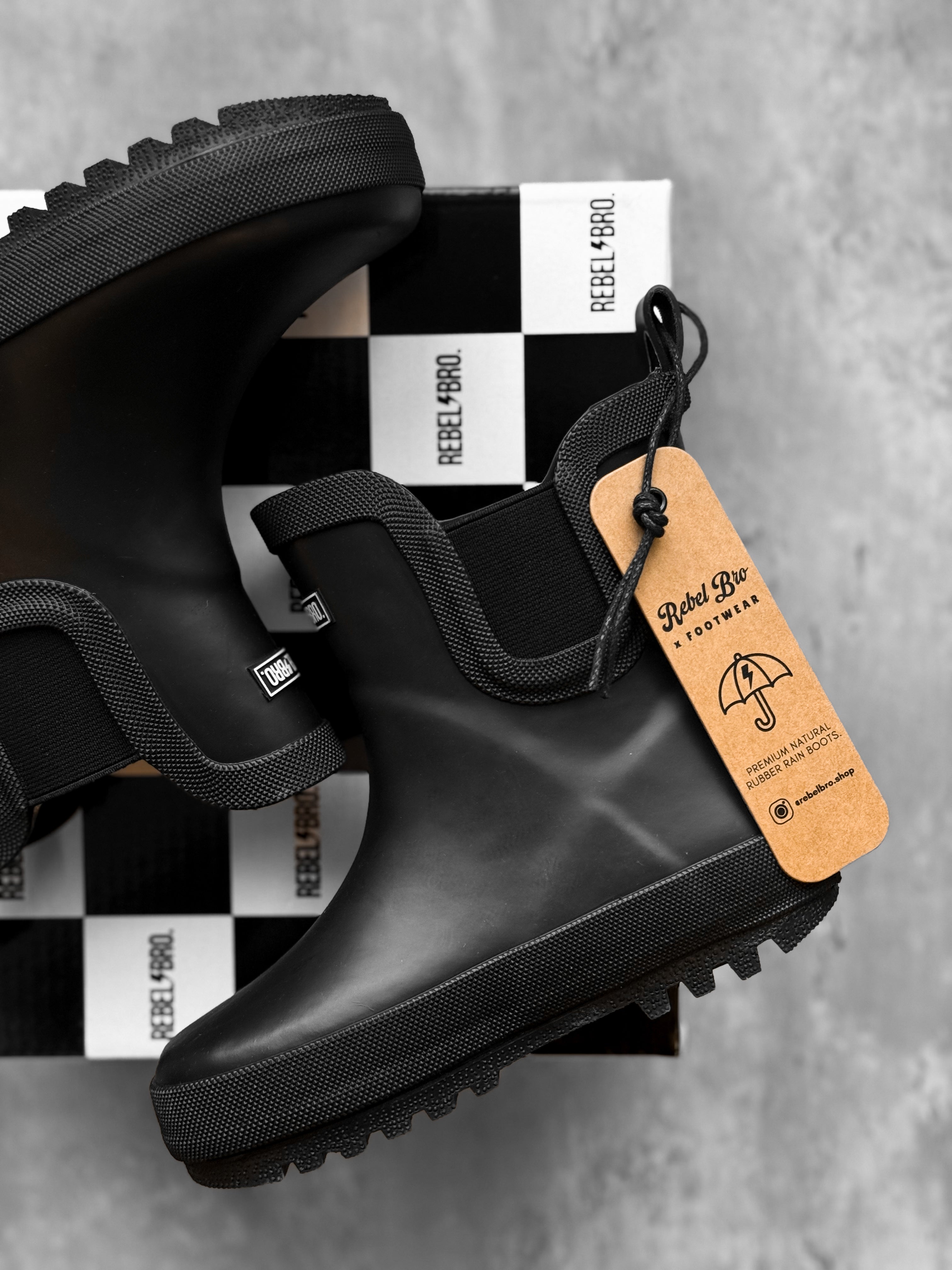 A Rebel Bro Exclusive. Crafted from 100% recycled natural rubber, this waterproof boot is both lightweight and flexible, ensuring all-day comfort.